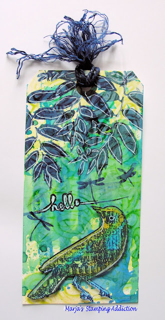 De bovenste kaart is gemaakt op een achtergrond van Dylusions inkt. De ganzen er op gesponst met blauwe en paarse inkt. De tekst er op gestempeld met blauwe Archival inkt. En de tekst is een clearstempel maar ik weet niet meer van wie.